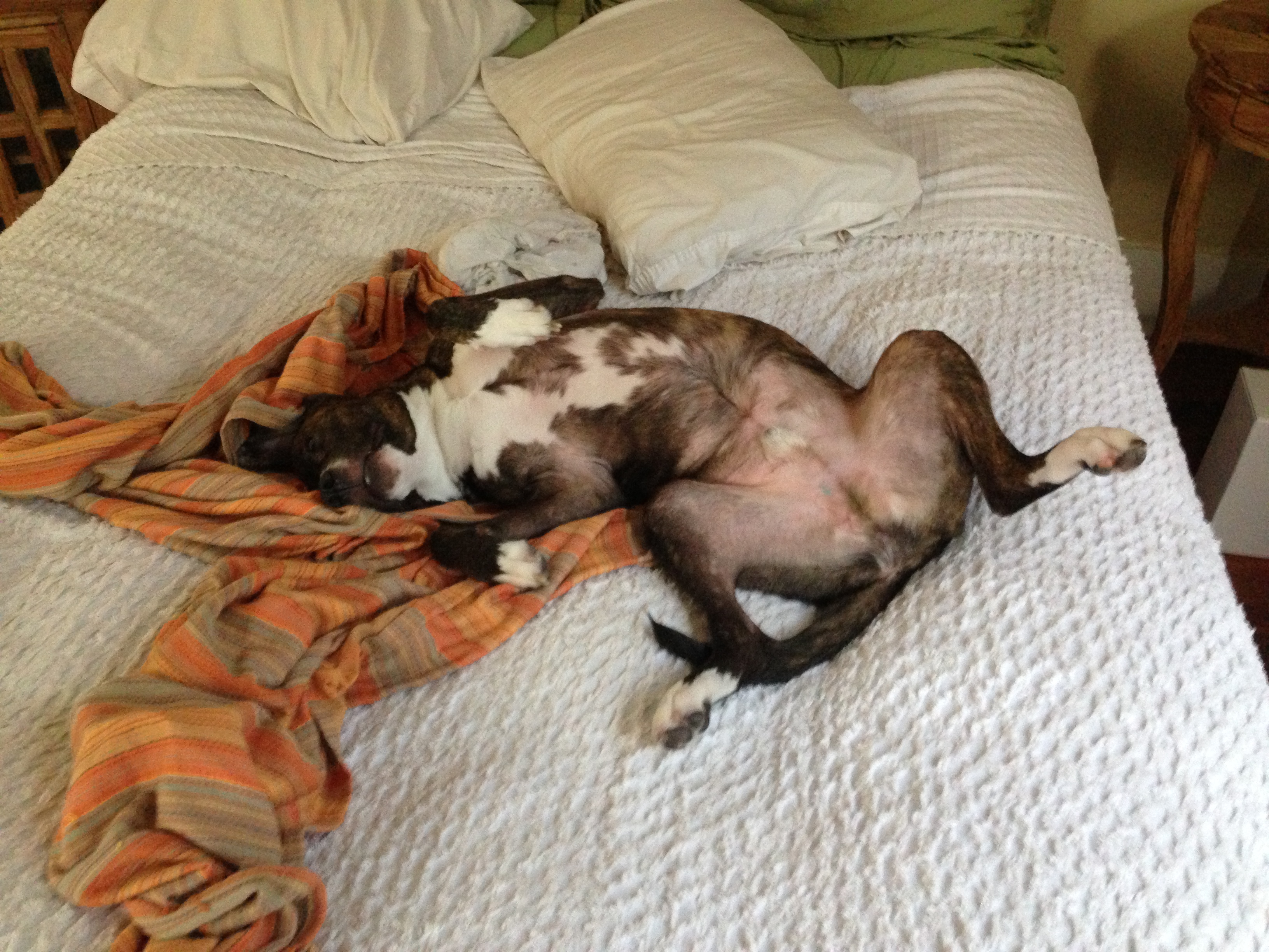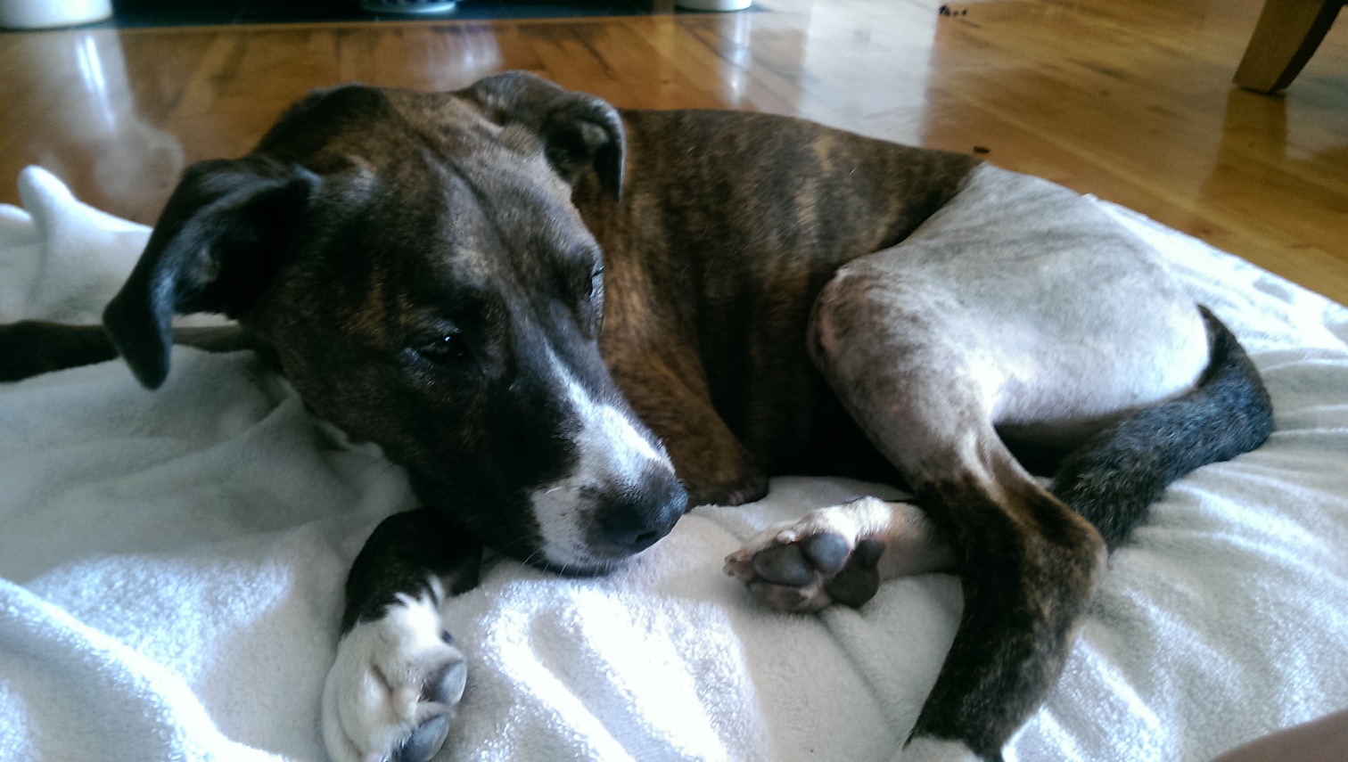 It was real pity, too. Not that stupid play on words because I’m part pit bull. It was honest to goodness pity. The next few days were a blur of sleep, pain meds, and personal service. My food was placed centimeters away from my face, I was carried up and down the stairs, and I was allowed to sleep anywhere. All of that would have been great if it didn’t feel like someone shaved my butt, cut my leg open and then tied a bunch of fishing line around my bones. Fortunately, things got better and then they got much better and then I was a super hero. Do you want to see me run and jump and swim and swim and swim and swim? I can do all of that now without the painful consequences. My left leg still gives me trouble and they say I’ll have to get that one fixed someday too, but I’m a pretty amazing 3.5 legged dog for now. Is that my horn tooting? Mom says I need to work on my humility. Shove it, Ma! I am the Hambone, the Ham of Ham and Potato, the Hambone whose hambone is connected to the hambone! I love exclamation points!!!!!! I love you, too.